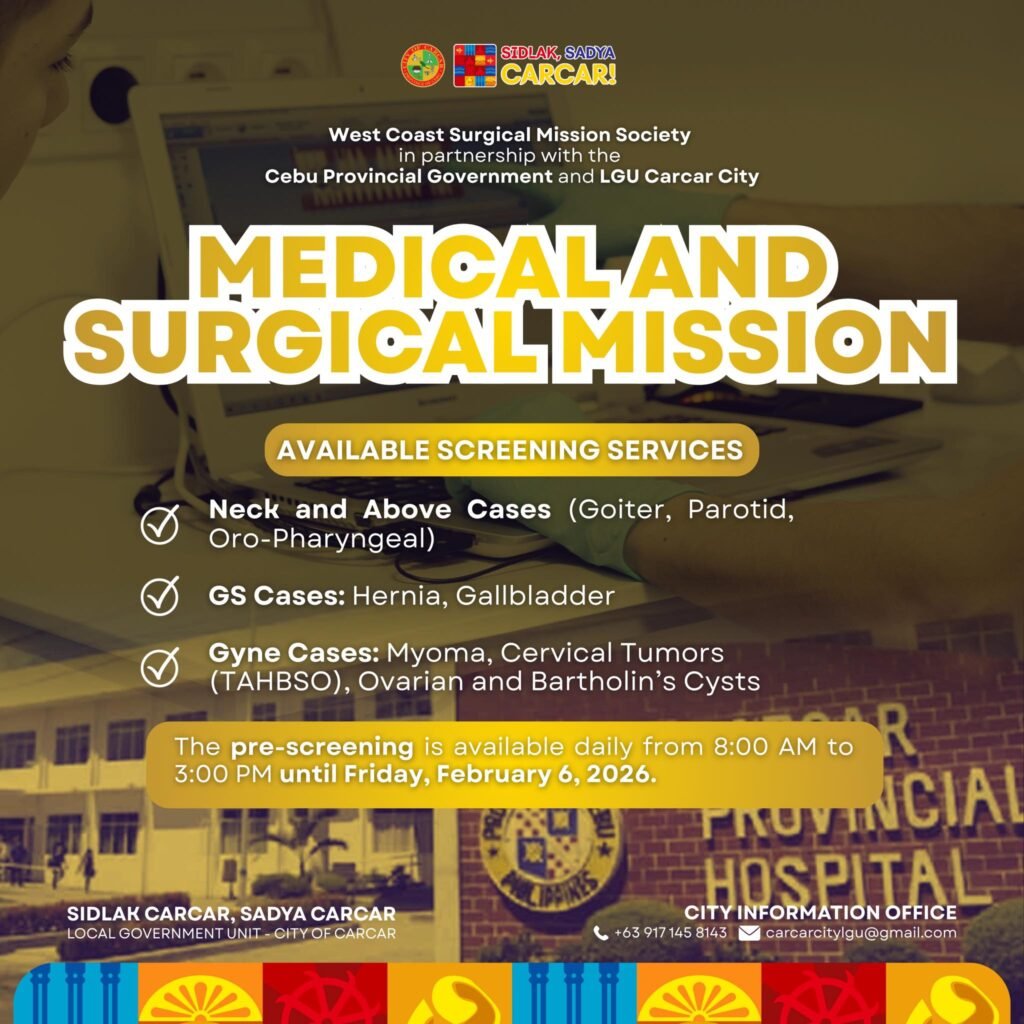 The City Government of Carcar, in partnership with the West Coast Surgical Mission Society and the Cebu Provincial Government, invites qualified constituents to avail of the Medical and Surgical Mission at Cebu Provincial Hospital–Carcar.
