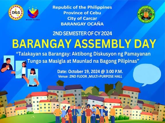 📢 PAHIBALO SA TANANG TAGA-BARANGAY OCAÑA Anaay Barangay Assembly karong umaabot:🗓️ Petsa: October 19, 2024 (Sabado)🕒 Oras: Alas 3 sa hapon📍 Lugar: 2nd Floor, Barangay Hall Giawhag ang tanan sa pagtambong.Daghang Salamat! #OcañaBarangayCouncil@highlight