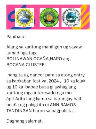 📢 Pahibalo alang sa mga taga Bolinawan, Napo, ug Barangay Ocaña 📌 Mga Kapitan: 🎉 Join us for the festivities and updates! #KabkabanFestival#BOCANACluster