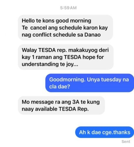 Maayong buntag sa tanan! 🌞 Pasensya kaayo sa short notice, mga maam/sir. As per 3A Prime Hospitality Training and Assessment Center, Inc., the training scheduled for today will not push through due to a conflict… 📌 Training Postponement Notice