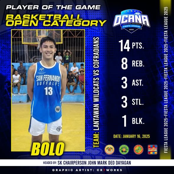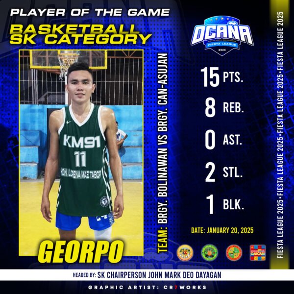๐ PLAYER OF THE GAMEGEORPO | Brgy. Bolinawan๐ Stats:โข Points: 15โข Rebounds: 8โข Assists: 0โข…